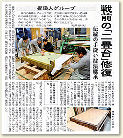 倉敷のお寺の二畳台(にじょうだい)の修復工事を請けました。 二畳台とは寺院仏閣などで使われる特殊な畳のことで、厚みが畳二枚分あります。しかも昭和12年に作られた物で、とても貴重な畳です。全てを新しくするのではなく、この畳を残したいと思いで修復にかかりました。中から当時の新聞が出くるなどタイムスリップした気分になりました。綺麗に仕上がり、無事に納める事が出来ました。 |
