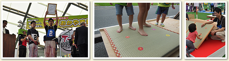 岡山ドームで畳業界の大イベントがありました。全国から2000人の畳関係者が集まり、T-1グランプリが開催されました。 全国から選び抜かれた選手が「畳業界の未来に繋がる畳を、自分流に表現して下さい」と言うお題に沿って、技術力、デザイン力、企画提案力を競う真の日本一を決める大会です。 そんなハードルの高い大会に岡山代表として三代目が出場しました。制作した畳は「音が出る畳」。踏むとドレミファソラシド♪と音が出ます。これからの日本を背負う子供たちの為に楽しみながら畳に触れてもらい畳を知ってもらいたいと言う思いで作りました。結果は準優勝に入りました。 |