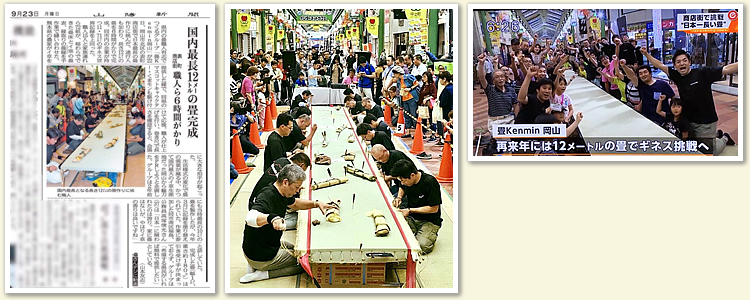 | 岡山県は昭和50年代までは日本最古の畳文化が存在している畳県(たたみけん)として、畳の素材である「い草」の生産量日本一を誇り、昭和の終わり頃までは小学校の社会の教科書にも載っていました。しかし現在では洋風化が進み和室が減り、畳の上で生活する子供達が少なくなってきています。そこで楽しみながら畳に触れてもらい、知ってもらうイベントを岡山表町商店街の中之町商店街で開催しました。 雑貨販売や小物作り体験、アトラクションなどがあり、その中でもメインイベントが12mの日本一長い畳作りに挑戦です。15名の職人が一斉に縫い上げる姿はまさに圧巻!大勢の人に応援されながら見事に作り上げ、日本一記録を達成しました。 |