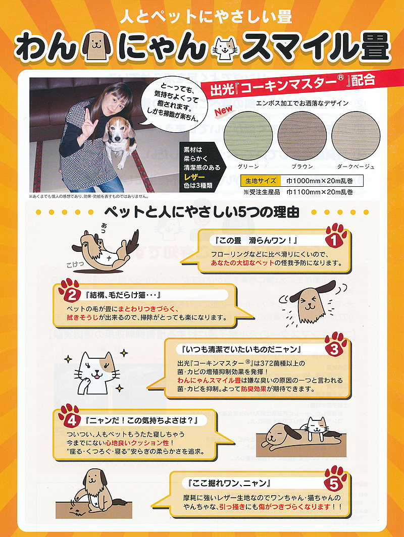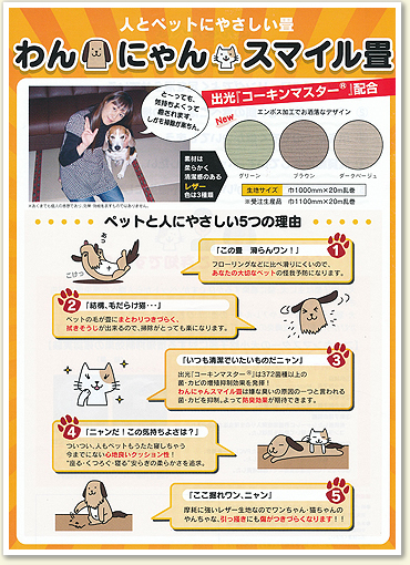 人とペットにやさしい畳。 特徴 滑りにくい 掃除がしやすい 臭いがつきにくい 傷がつきにくい 愛するペットのためにも!