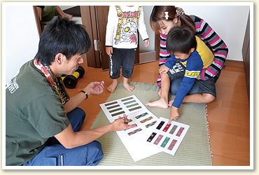 お客さまのご都合の良い日時に、直接見本を持ってご説明します。 少しでもお客さまの理想のお部屋に近づけたいので畳床、畳表、畳縁など納得のいく物を用意します。 品揃えも豊富! |